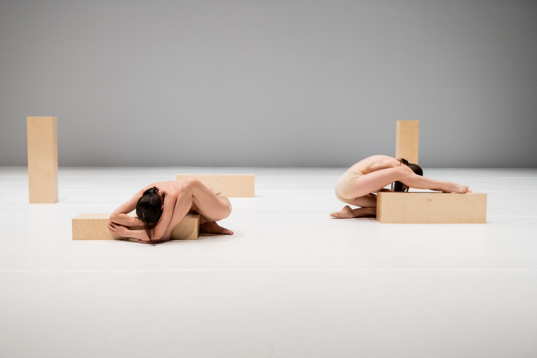 Two dancers move slowly on rectangular wooden blocks which act as bases before being intimately integrated into their bodies. The music follows the refined detail of their movements, making it heard what the two dancers perceive, in a mesmerizing progression, a dramatic rise where their supple flesh intimately meets the edges of the pedestals.